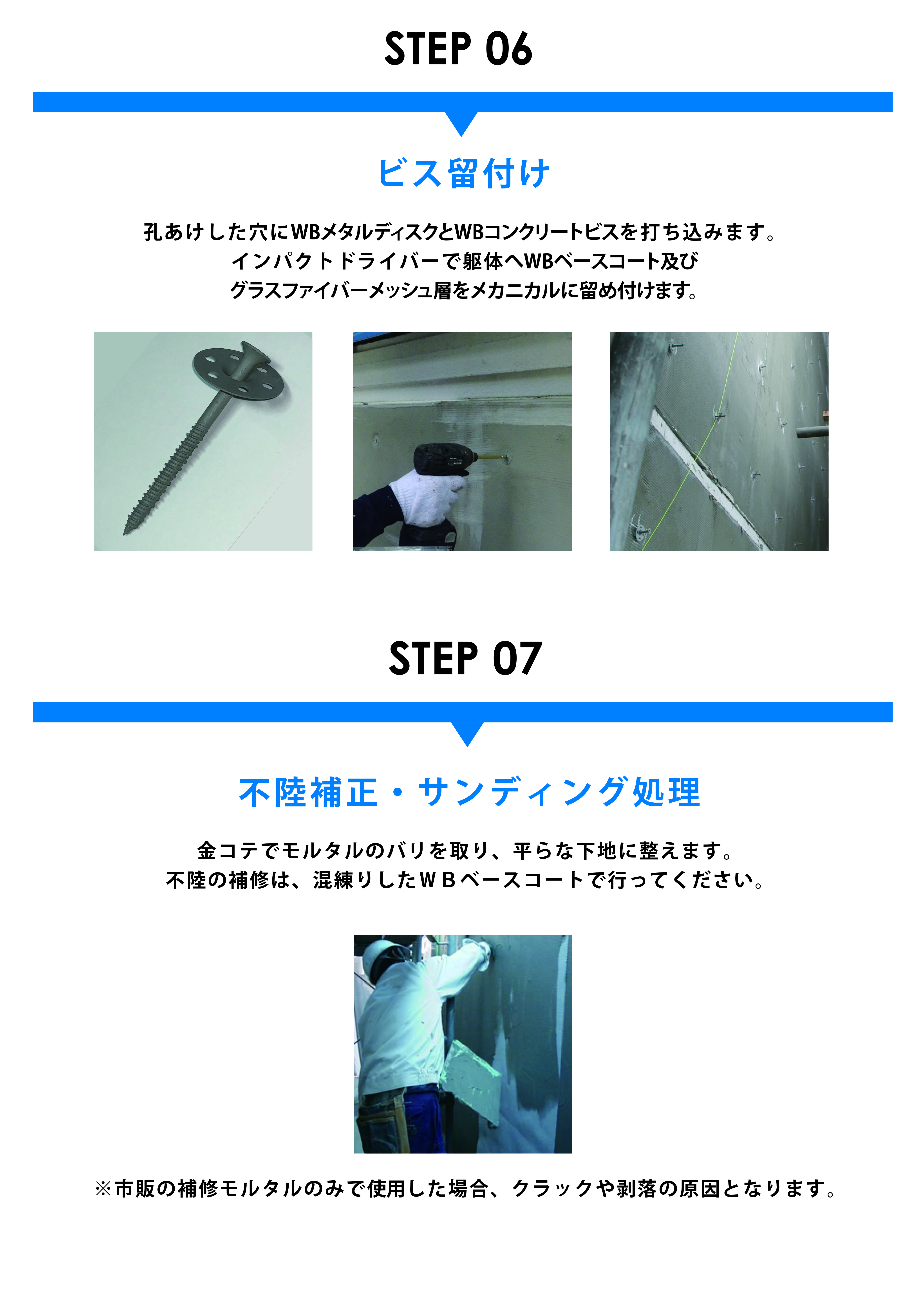 接着力の強いベースコート、引張強度が強いグラスファイバーメッシュ、 そしてメカニカルなビスの留付けを全面に施すことにより、外装と躯体を一体化させます。