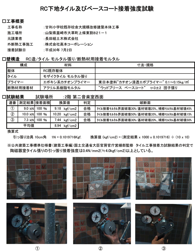 ↑ タイルの接着試験強度 < 断熱材用接着材であることがこの試験から判明しています。3h>
